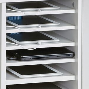 Devices sit horizontally within individually secured yet roomy compartments to protect the devices during charging