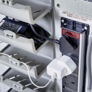 Device adaptors plug into 2 x 10-way power strips designed and manufactured in-house