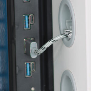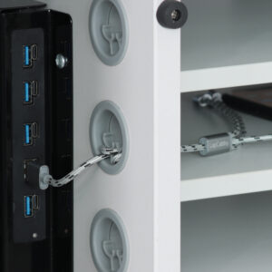 Cable clip portholes located in the side of each device storage shelf to ensure cable is locked into position