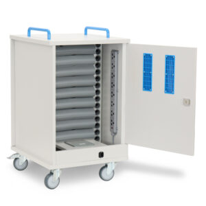 The Lyte 16 Single Door Plastic Shelf Mobile charges 16 devices up to 15.6″ screen size – Chromebooks, laptops and tablets (including protective cases), POS devices and other chargeable equipment.