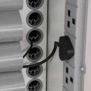 Cable clip channels located in the side of each device storage shelf to ensure cable is locked into position