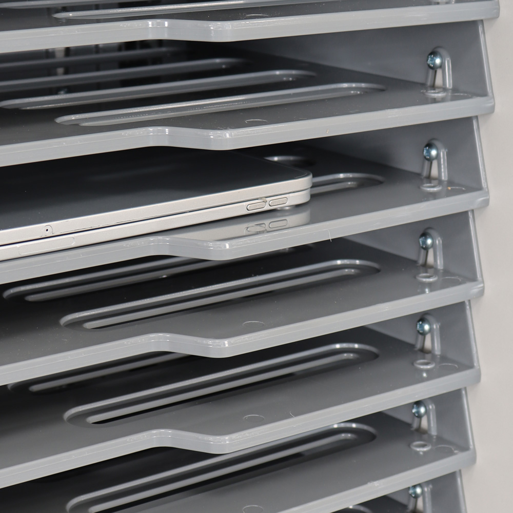 The Lyte 16 Single Door Plastic Shelf USB C Mobile charges 16 devices up to 15.6” screen size – Chromebooks, laptops and tablets (including protective cases) via dual USB A and USB C charging hubs.