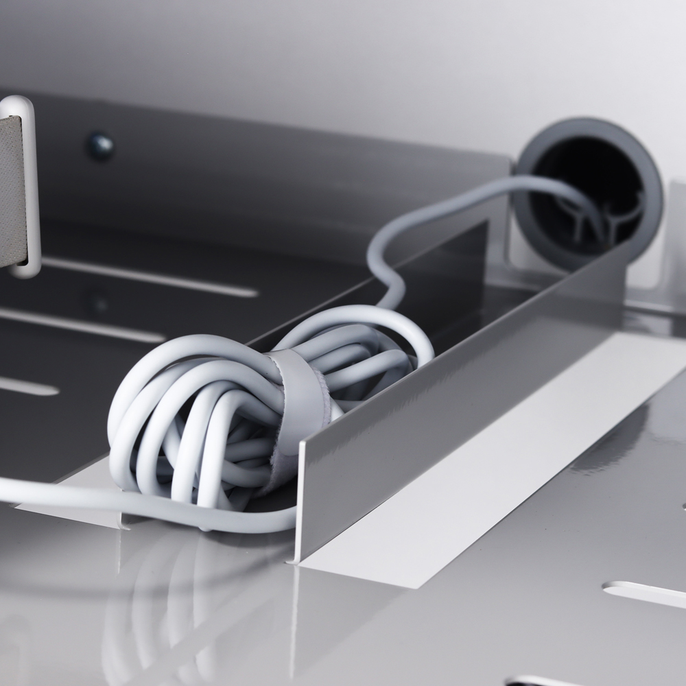 Cables feed from back power compartment to front device compartment via portholes with secure anchor points, preventing cables being removed with the device